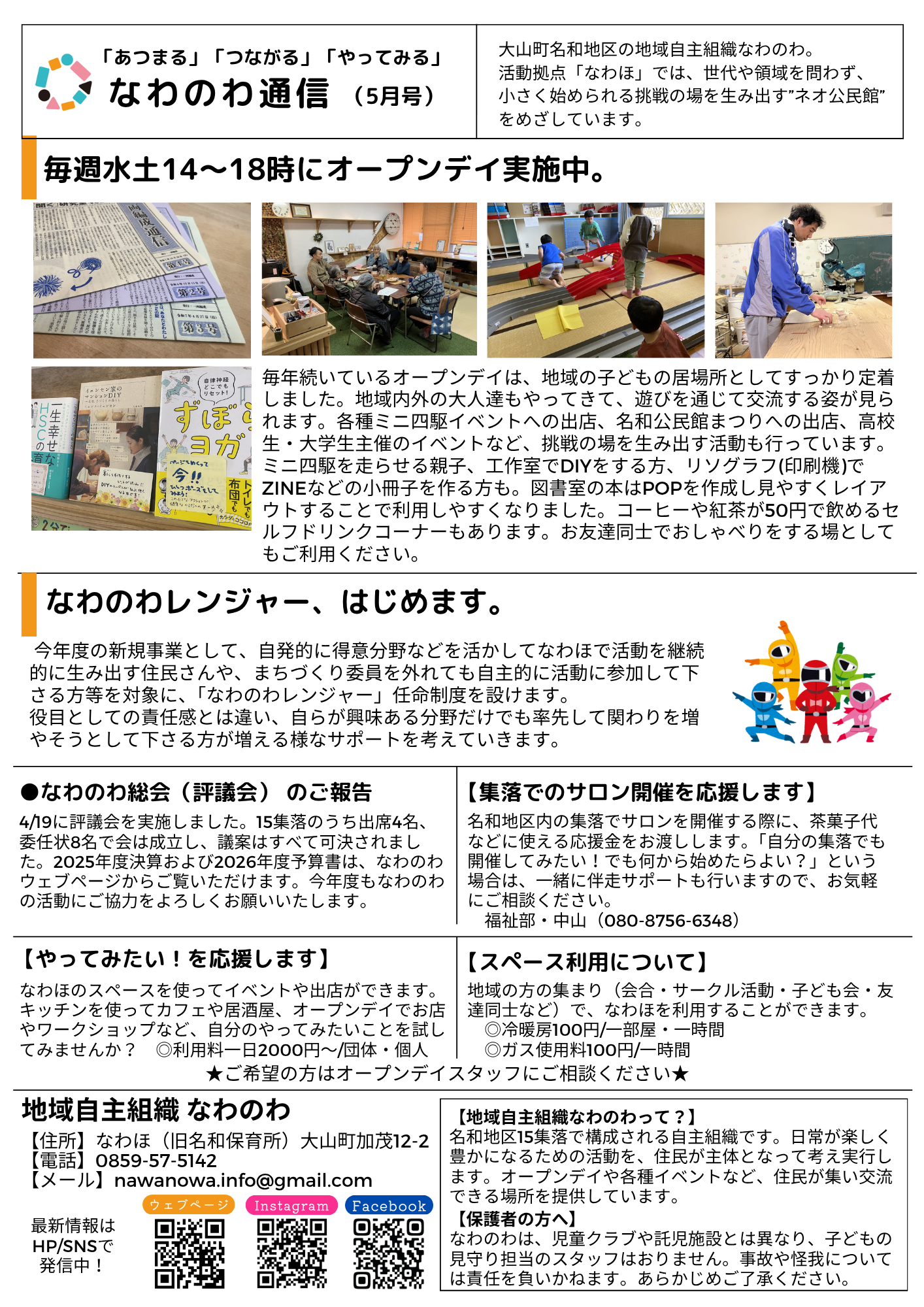 なわのわの活動拠点である「なわほ」では世代を問わず小さく始められる挑戦の場を生み出す「ネオ公民館」を目指しています。